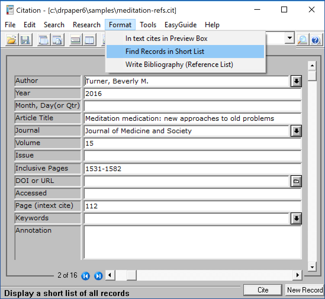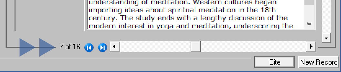 Find the entry for the work you want to cite in your datafile.There are several ways to find the entry for the work you want to cite in your datafile. The simplest method is to use the PgUp and PgDn keys on your keyboard to step through the entries in your datafile. You can also click on the arrows at the bottom of the edit panel to step forward or backward through the entries. In many cases, however, you will want to use one of the search functions.