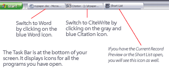 Switching between CiteWrite and Word is easy. You can do this easily by clicking on the CiteWrite icon