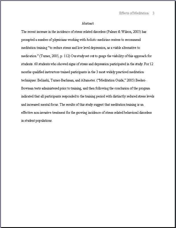 ABSTRACT PAGE An abstract should be a brief summary of the paper's primary premise and findings, no more than 120 words. For the abstract page, center the word "Abstract" at the top of the page, and then include the abstract for the paper, double spaced, and flush against the left margin. Here's a condensed version of what the APA Manual (12) says about abstracts: An abstract is a brief, comprehensive summary of the contents of the article; it allows readers to survey the contents of an article quickly. . . The abstract needs to be dense with information but also readable, well-organized, brief, and self-contained. . . . Ensure that the abstract correctly reflects the purpose and content of the paper. Do not include information that does not appear in the body of the paper. If the study extends or replicates previous research, note this in the abstract, and cite the author and year. . . . Comparing an abstract with an outline of the paper's headings is a useful way to verify its accuracy. . . . . Abstracts should not exceed 120 words. Begin the abstract with the most important information (but do not waste space by repeating the title). Include in the abstract only the four or five most important concepts, findings, or implications. An abstract should report on, rather than evaluate, the content of your paper -- do not add to or comment on the content of the paper.